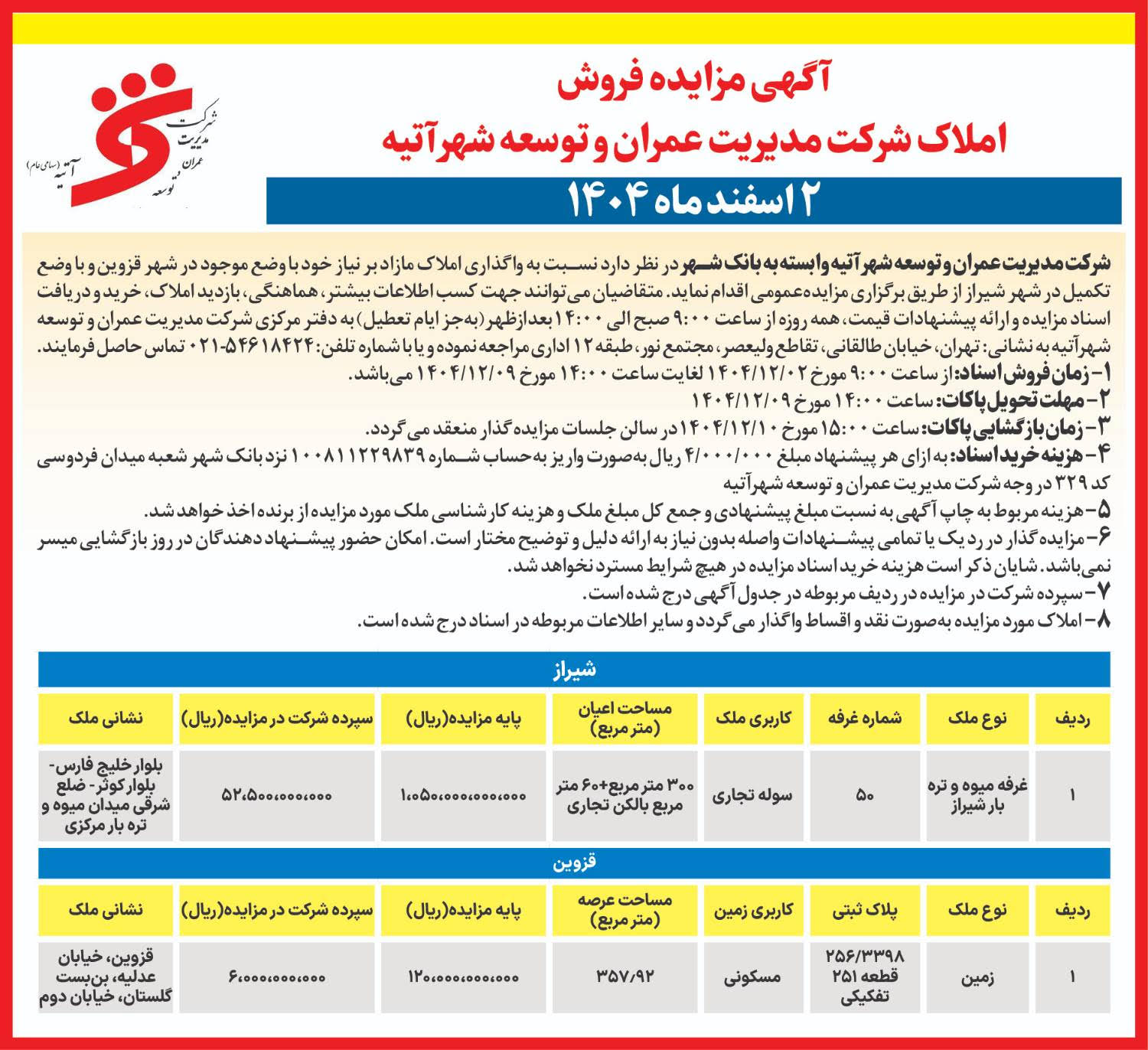 آگهی مزایده فروش املاک شرکت مدیریت عمران و توسعه شهرآتیه اسفند ماهآگهی مزایده فروش املاک شرکت مدیریت عمران و توسعه شهرآتیه اسفند ماه